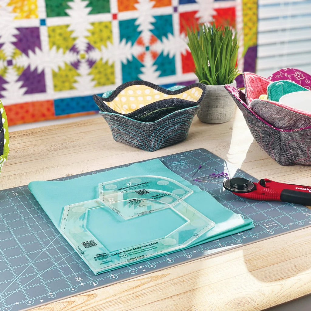 Make perfect, microwave-safe bowl cozies with ease using the Creative Grids Bowl Cozy Template Set. This nested ruler includes both 11" and 16" templates for small and large cozies—simply fold your fabric in quarters, rotary cut around the template, and you're ready to sew with two squares of fabric and batting. Designed with Creative Grids' exclusive gripper technology, it slides smoothly over fabric and stays firmly in place when cutting to prevent slips and miss-cuts. Featuring clear, easy-to-read markings and made in the USA, this tool ensures consistent results every time—just remember to use 100% cotton fabric, batting, and thread for microwave safety.