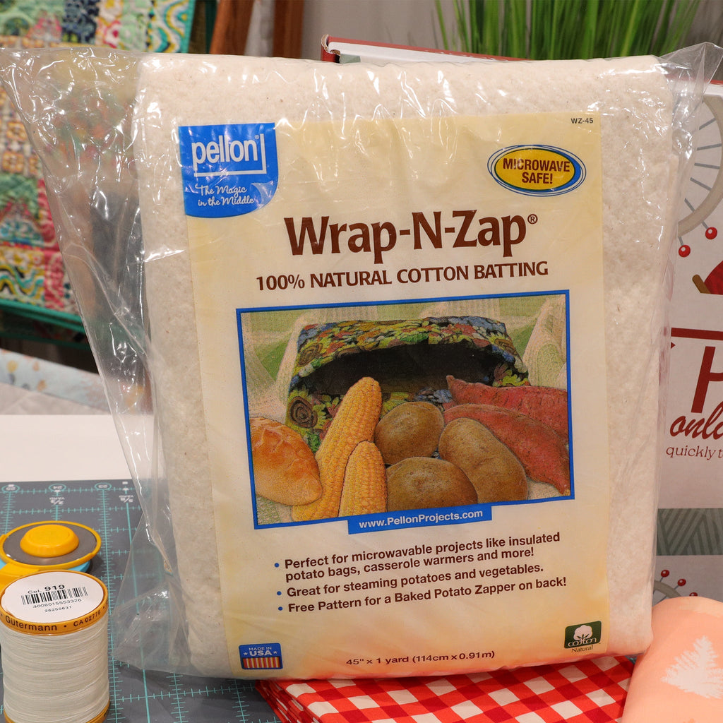 Pellon® Wrap-N-Zap® is a 100% natural cotton batting designed for safe use in the microwave, perfect for creating projects like potato zappers, corn steamers, and tortilla or roll warmers. The natural cotton fibers trap moisture, helping food cook evenly while maintaining softness and flavor. Wrap-N-Zap® contains no additives, scrim, or flame retardants, making it microwave-safe when used correctly—always with food, never empty, and in one-minute intervals up to eight minutes. For best results, use only 100% cotton fabric, batting, and thread, and never more than two layers at seams. To minimize shrinkage, pre-soak the batting in hot water for 20 minutes, then lay flat to dry. Once your project is complete, it can be machine-washed on a gentle cycle and dried on low. Please note: Wrap-N-Zap® is not fireproof, should never be used in convection/microwave ovens, and microwaves vary by wattage—so always monitor your project closely and never leave the microwave unattended.