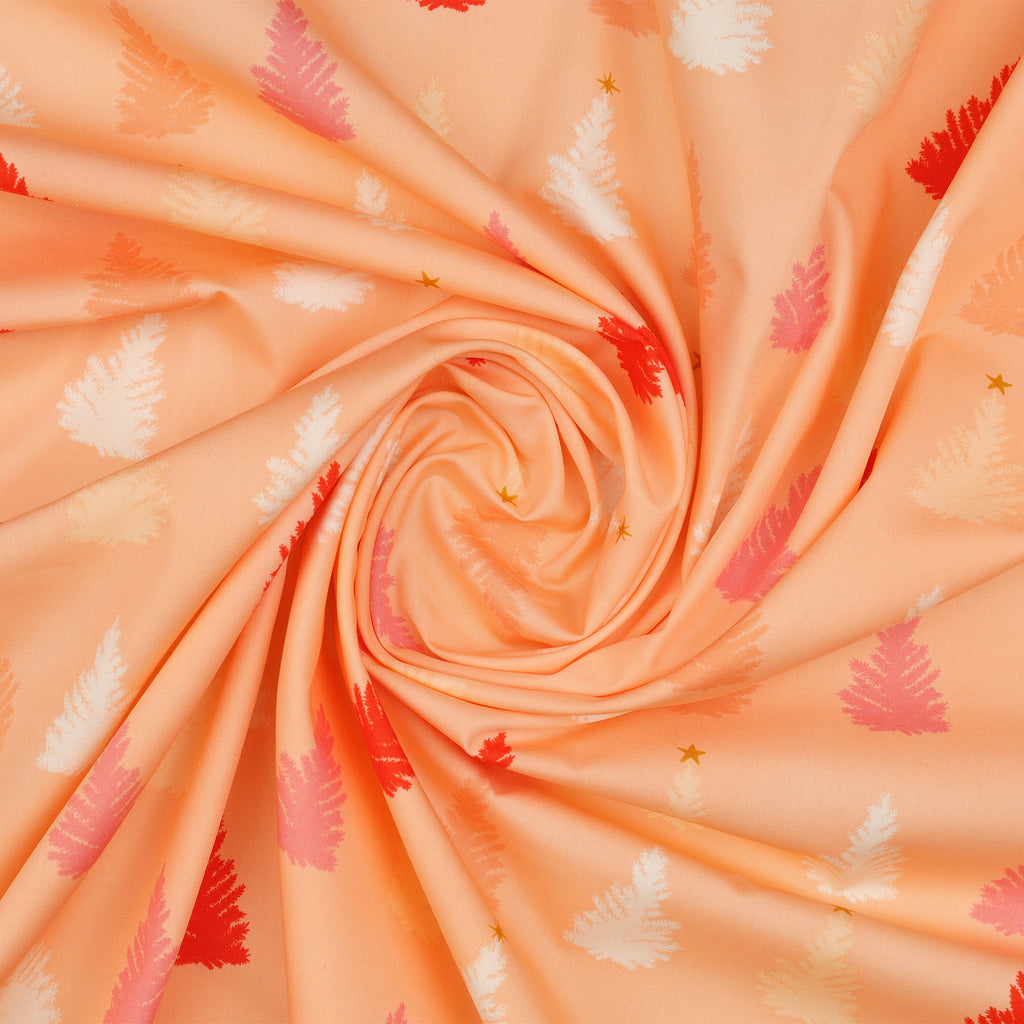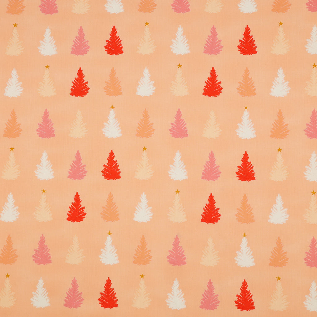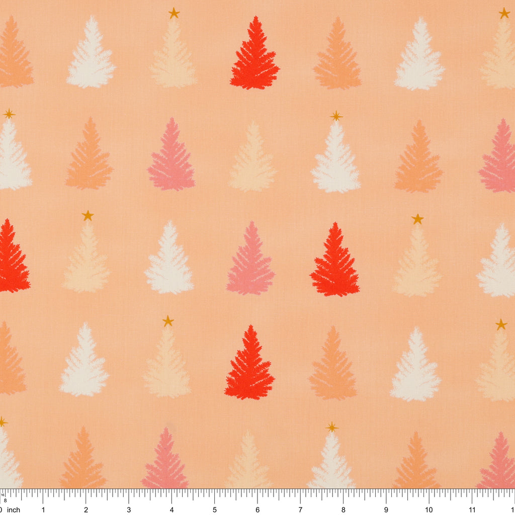 Add a festive splash of whimsy to your holiday sewing with the Tree-mendous Festivities fabric, designed by AGF Studio. Made of 100% cotton, this cheerful print features rows of stylized Christmas trees in coral, peach, pink, white, and bright red against a soft peachy background, with a few topped by golden stars for an extra touch of sparkle. With a 7-5/8" pattern repeat and each tree measuring approximately 1-3/4" tall by 1" wide, this fabric offers perfect balance between playful detail and modern design. Ideal for quilts, reusable gift bags, stockings, and cozy holiday décor, Tree-mendous Festivities adds warmth and joy to every handmade creation.