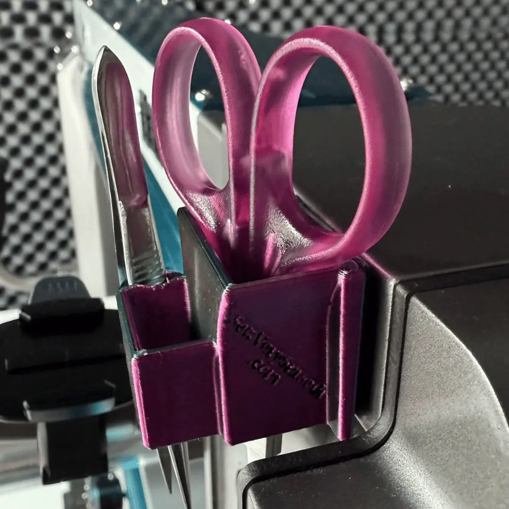 The practically perfect tool to keep your scissors and thread snippers where you want them to be! Introducing Annie's Scissor Holster 2.0! Two slots for your prized and rather expensive scissors to stay safe and available, and showing off an additional space for your seam rippers or stylus or pen. Annie's Scissor Holster uses our acclaimed Sew-Tacky Technology to adhere to your sewing machine, cutting table, craft table or simply out of reach of those young and tiny little helpers that frequent your creative space with wandering hands! Another quality product from Sew Very Smooth! Made in America by our family!!