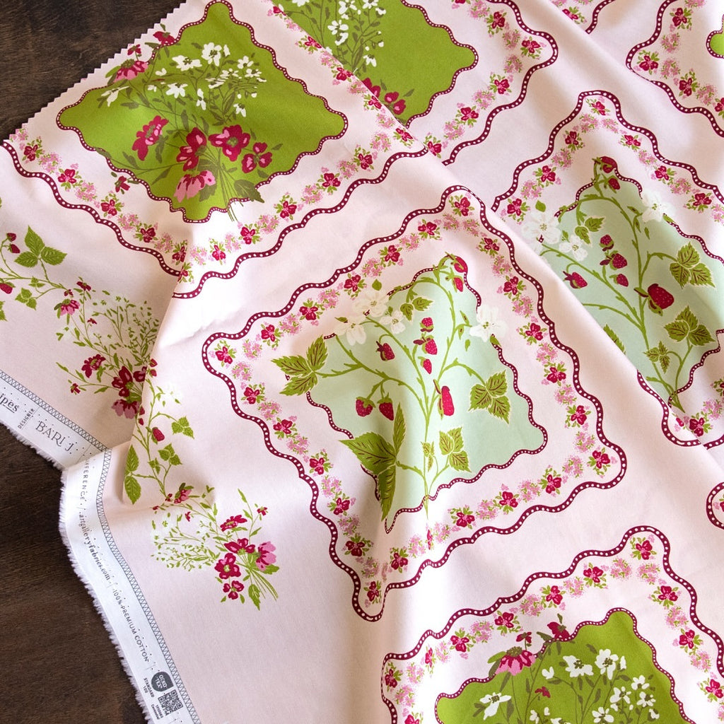 This adorable pattern features a charming countryside elegance. Featuring luscious strawberries, delicate blossoms, and intricately detailed leaves, the pattern is framed by wavy scalloped edges and rows of petite floral accents. The combination of soft greens, blush pinks, and rich berry tones evokes a vintage-inspired, folkloric aesthetic perfect for any project. This fabric’s intricate panel design makes it ideal for creating standout projects with a nostalgic yet fresh feel.