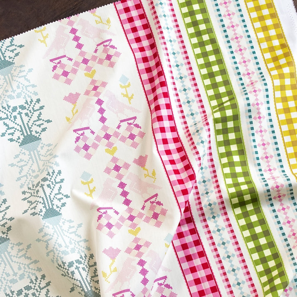 A harmonious mix of classic and whimsical patterns. Bold red gingham stripes take center stage, complemented by intricate diamond and checkered patterns in soft blue and pink hues. Adding a unique touch, delicate cross-stitch motifs of florals and birds bring a handcrafted charm to the design. Capture the essence of warmth and tradition with a modern twist.