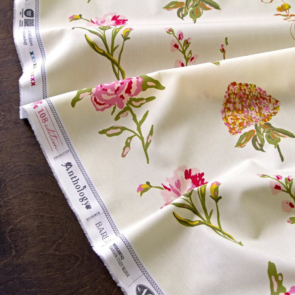 The Garden Study Blush quilt backing brings a fresh, floral elegance to the reverse side of your quilt. Featuring scattered painterly blooms in soft shades of pink, rose, and berry on a warm cream background, this print mirrors the beauty of a garden in bloom. Printed on 100% cotton and measuring a generous 108 inches wide, it’s designed to eliminate seams on larger projects and add a polished, cohesive finish. With its soft color palette and romantic motif, Garden Study Blush transforms quilt backs into a true work of art.