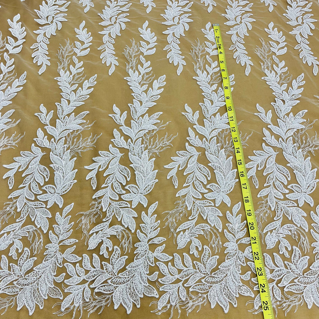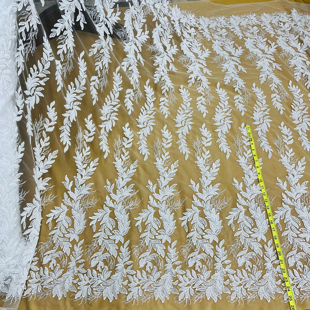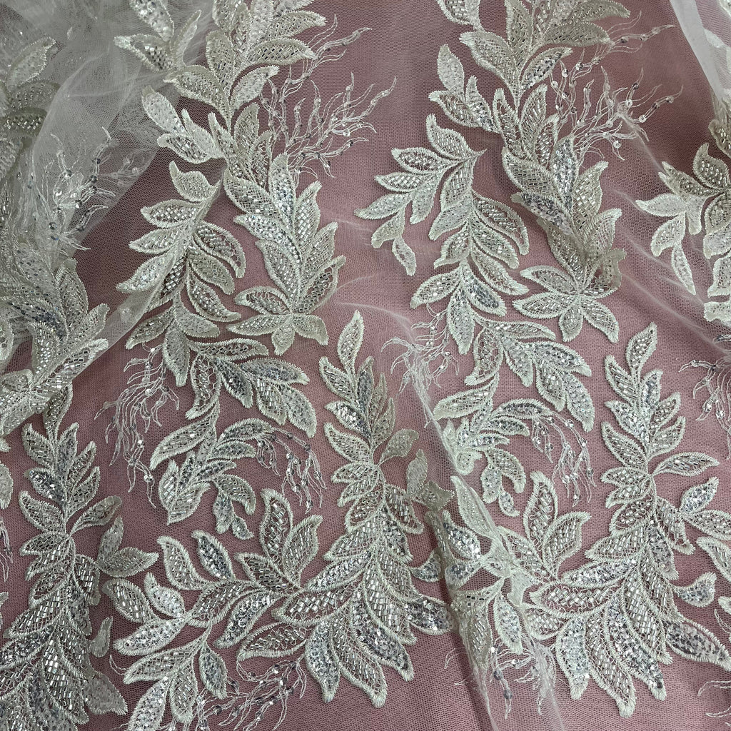 Handmade, high quality Beaded Lace Fabric Embroidered on 100% Polyester Net Mesh. Beautiful on wedding dresses, evening gowns, dance costumes, and more.