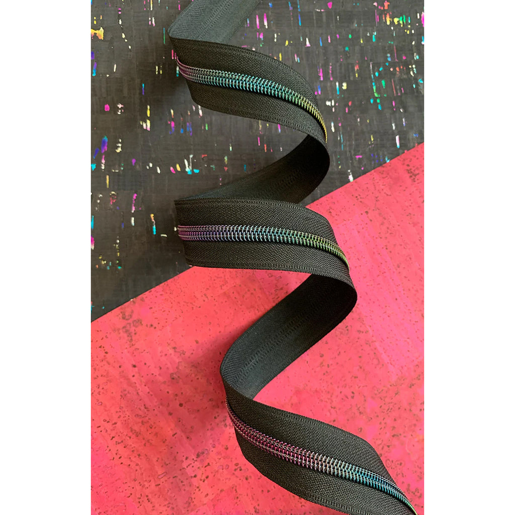 Sassafras Lane Designs Black Zipper Tape with Rainbow Teeth is a fun and vibrant addition to any sewing project. This zipper tape comes on a convenient 3-yard roll and is 1-1/4" wide, featuring a durable #5 zipper size that's perfect for various applications, from bags to garments. The colorful rainbow teeth add a playful touch to your creations, making them stand out. The tape is easy to work with, as it can be effortlessly cut to size using either scissors or a rotary cutter, allowing for customization to fit your specific needs. Plus, coordinating zipper pulls are available separately, letting you complete your project with a polished, professional look. Whether you're a seasoned sewer or just starting out, this zipper tape offers both style and functionality for all your sewing adventures.