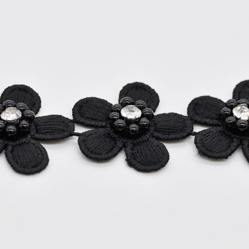Flower Trim with Pearl Rhinestone - 1 1/2" Width (15 Yard Roll) - BFT-1200-02 Black