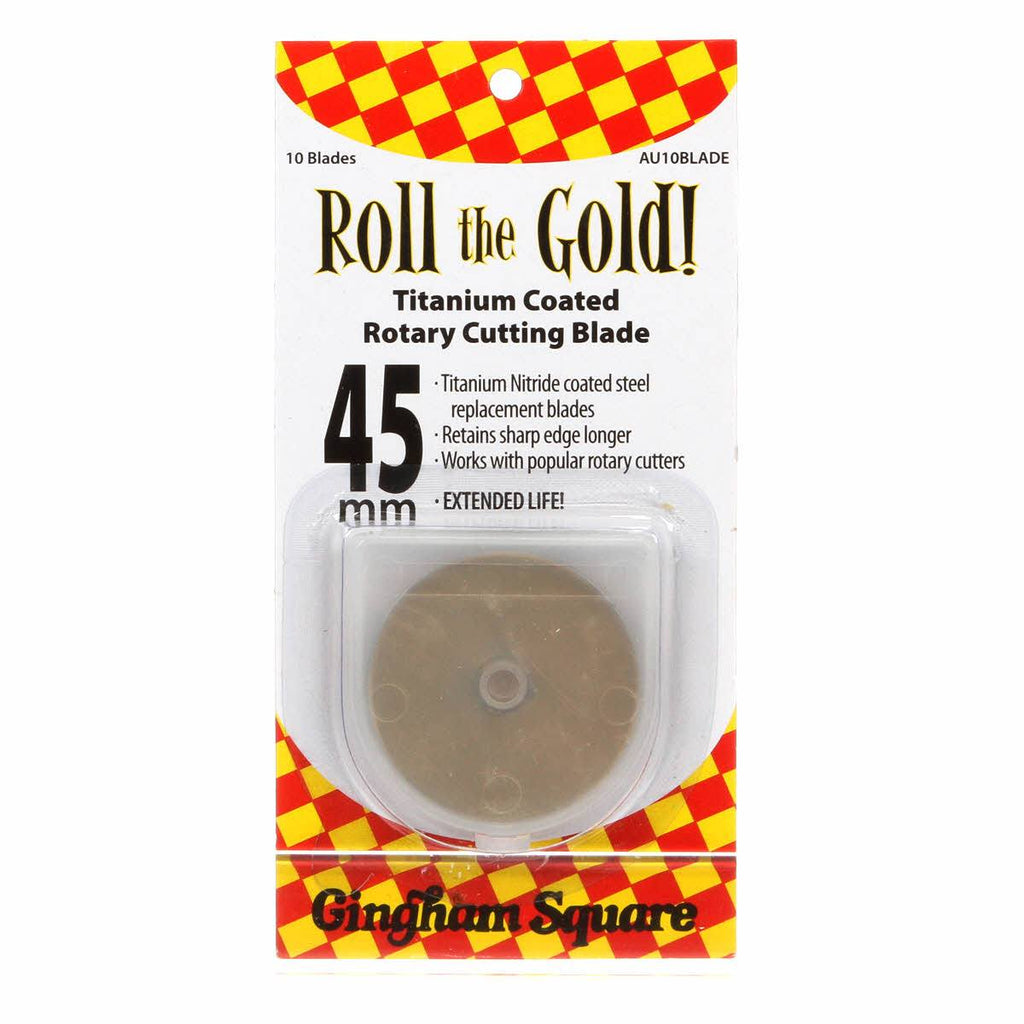 Titanium coated steel rotary blades maintain a sharp edge longer than traditional rotary blades. This eye-catching gold colored blade works with many 45mm rotary cutter handles. Package contains 10 blades.