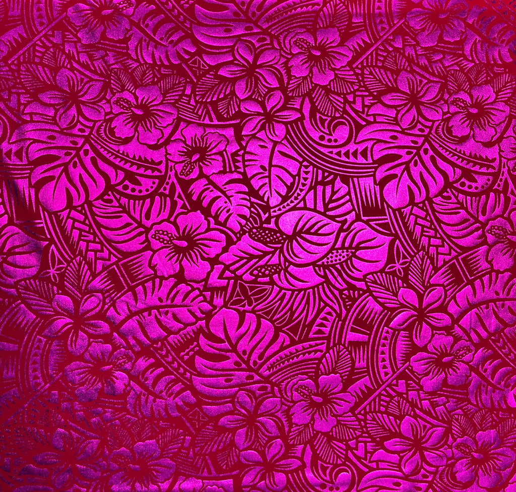 Discover the allure of paradise with this stunning tropical fabric featuring an enchanting blend of hibiscus, plumeria, tiare, monstera, musa acuminata, and anthurium leaves. Woven together with intricate tribal tattoo motifs, this polyester foil creation delivers a captivating shiny finish that catches the light beautifully. Perfect for adding exotic elegance to your sewing projects, home décor, or fashion designs. Transform your vision into something truly extraordinary with Islands Fabric's premium tropical collection.