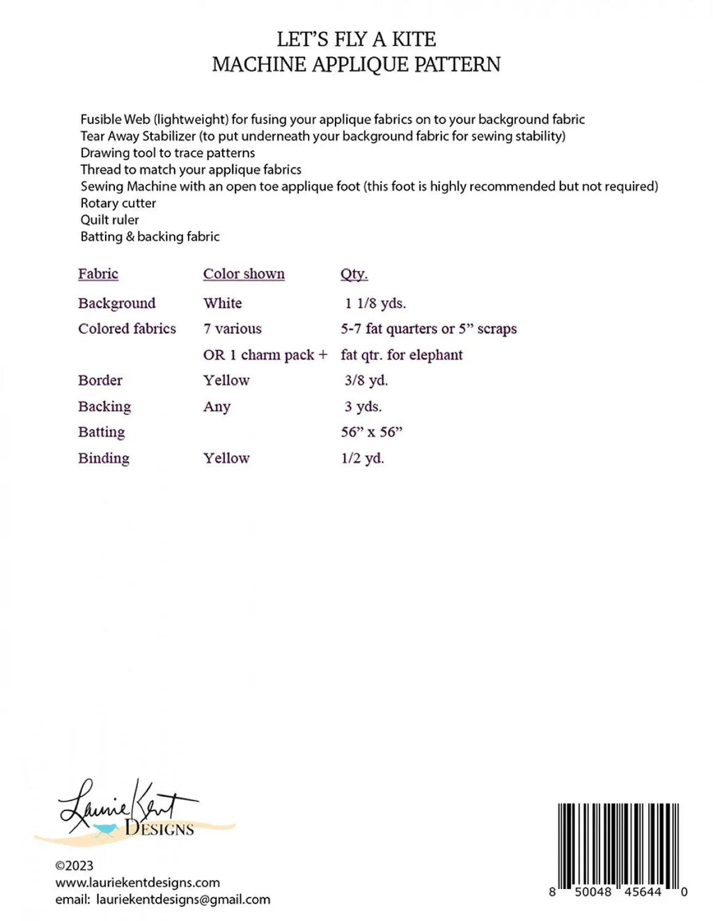Let's Fly a Kite Pattern - Beginner-friendly pieced & machine applique pattern by Laurie Kent Designs. Full-size template with instructions for you. Approximate size 45 X 45 Great as part of a quilt or a fun wall hanging in a child's room or nursery. Choose your color scheme to match your favorite color combinations.