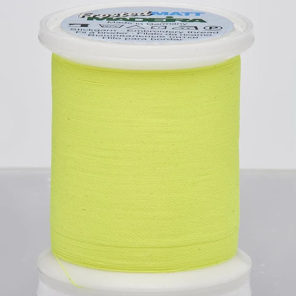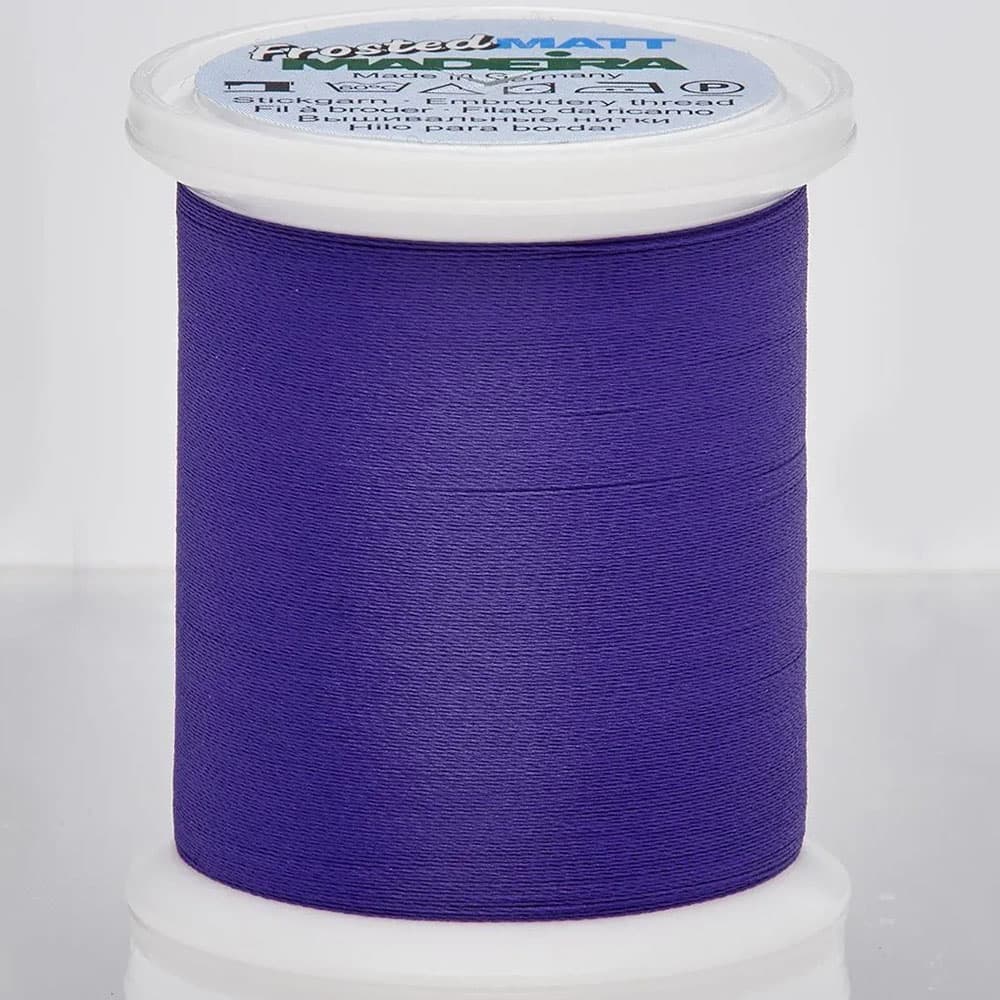 Madeira Frosted Matt #40 Thread is an authentic matte finish and light-fast polyester thread that's perfect for embroidery, quilting, and serging projects. Its vivid colors give it a high-definition appearance, adding dimension and clarity to designs. Frosted Matt Thread is made using a colorfast polyester filament with a ceramic core that resists fading from bleaching and sunlight (96% polyester and 4% ceramic). Frosted Matt is slightly thinner than a standard 40-weight embroidery thread, so Madeira recommends a 65/9 or 75/11 needle for best results. Each Madeira Frosted Matt Thread spool contains 546 yards (500m) and has double-locking end caps.