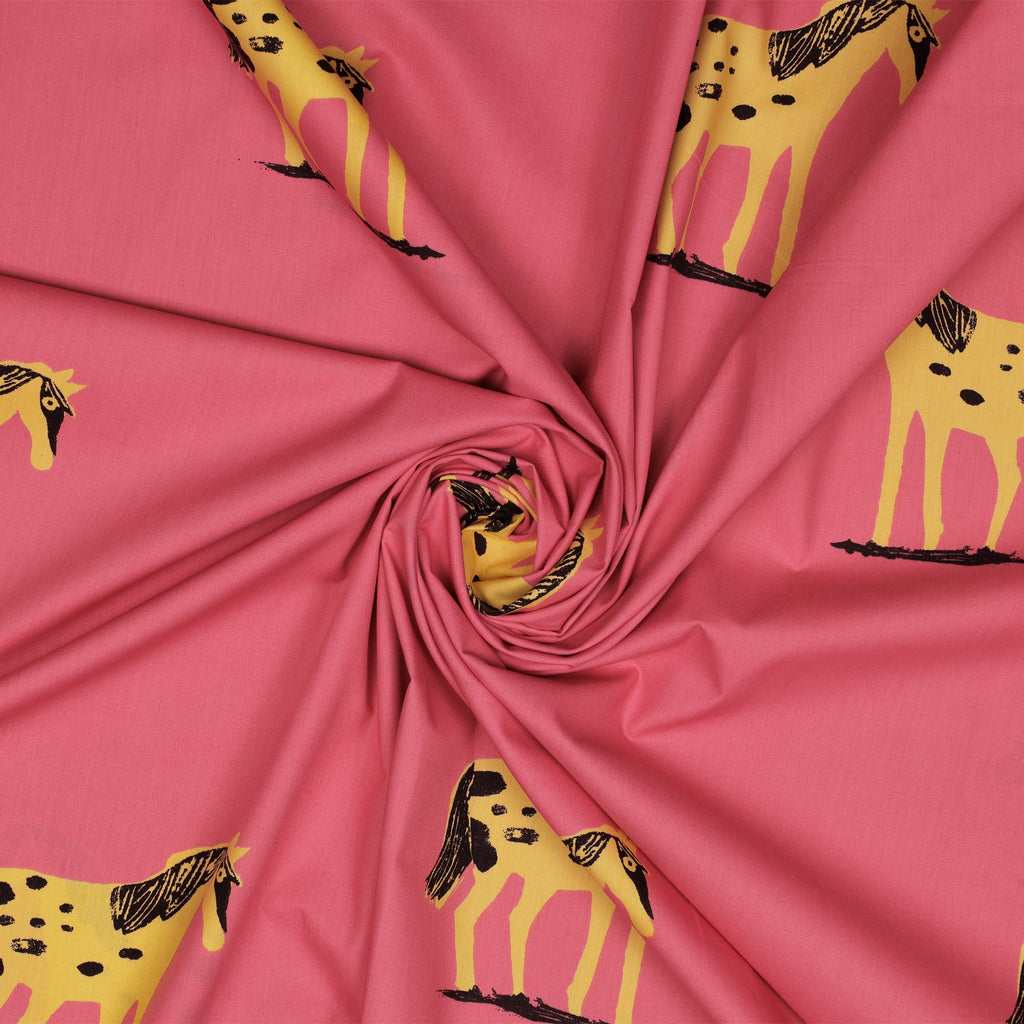 Sun-soaked fields and long summer days come to mind with this vibrant print, where playful ponies wander across a bold backdrop as if exploring their own colorful world. The bright pink background gives Wild Ponies Hot Pink an instant burst of personality, making each golden-yellow pony stand out like a character in a hand-drawn storybook. Their spotted coats, flowing manes, and simple, stenciled style add an enchanting charm that feels both retro and refreshingly modern. The wide spacing between each pony keeps the design airy and uncluttered, perfect for quilt backs or bedding that needs a joyful, energetic touch. With its mix of warm yellows, soft browns, and that standout pink, this print pairs beautifully with playful palettes or softer coordinating tones. Whether you're crafting something for a child's room or adding a pop of cheer to your own quilt, Wild Ponies Hot Pink brings a fun, free-spirited feel to every stitch.