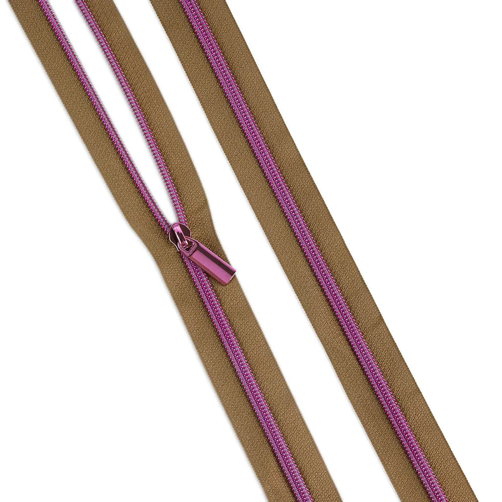 Natural #5 Nylon Tula Pink Coil Zipper 3yds and 9 Pulls: #5 Zippers by the Yard contain 3 yards of Zipper Tape with Nylon Teeth and 9 matching pulls. Coordinate the zipper tape color with your fabric and match the zipper teeth color with your purse hardware! Easily cut and sew through the nylon teeth while achieving the appearance of metal teeth.