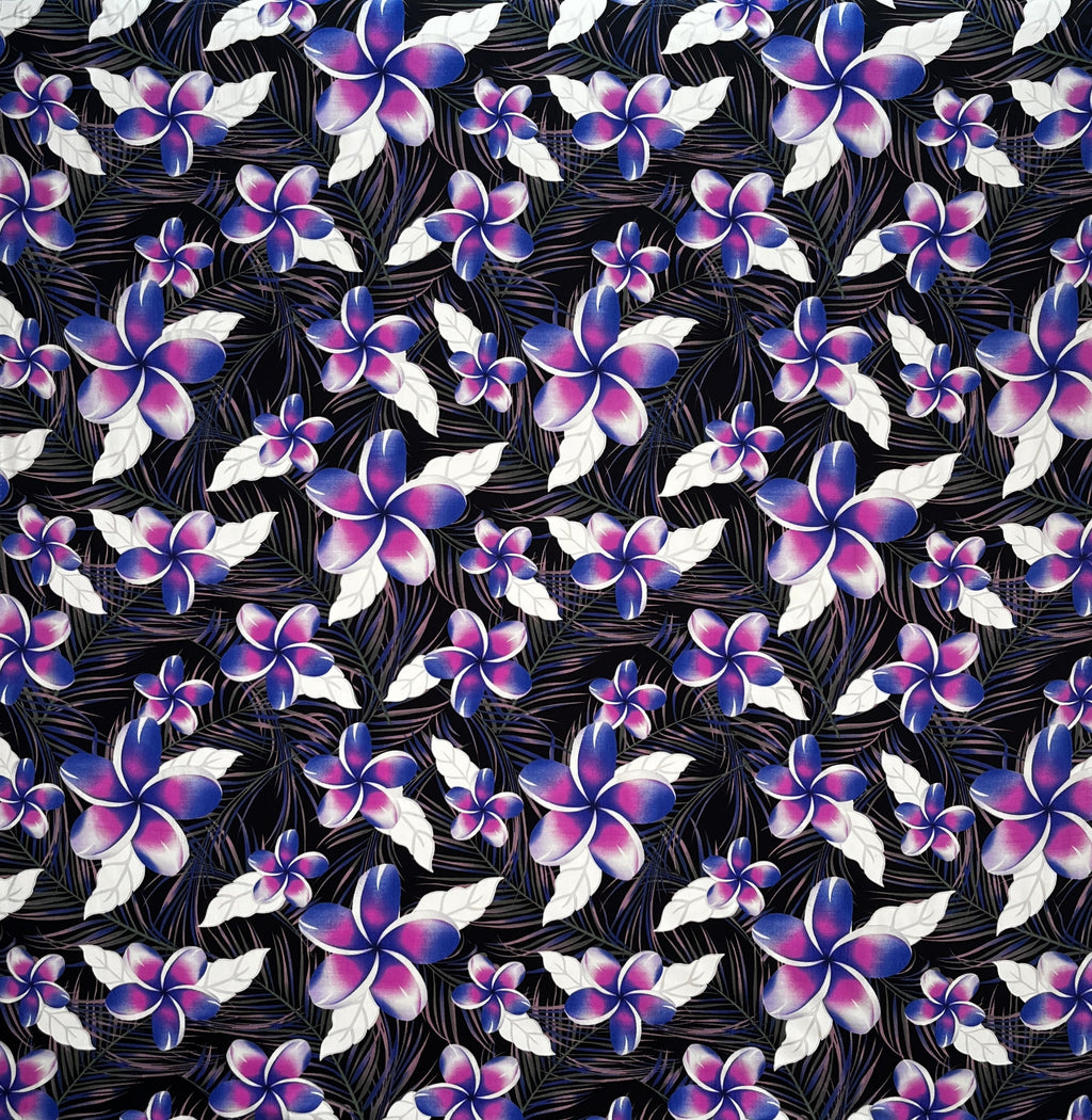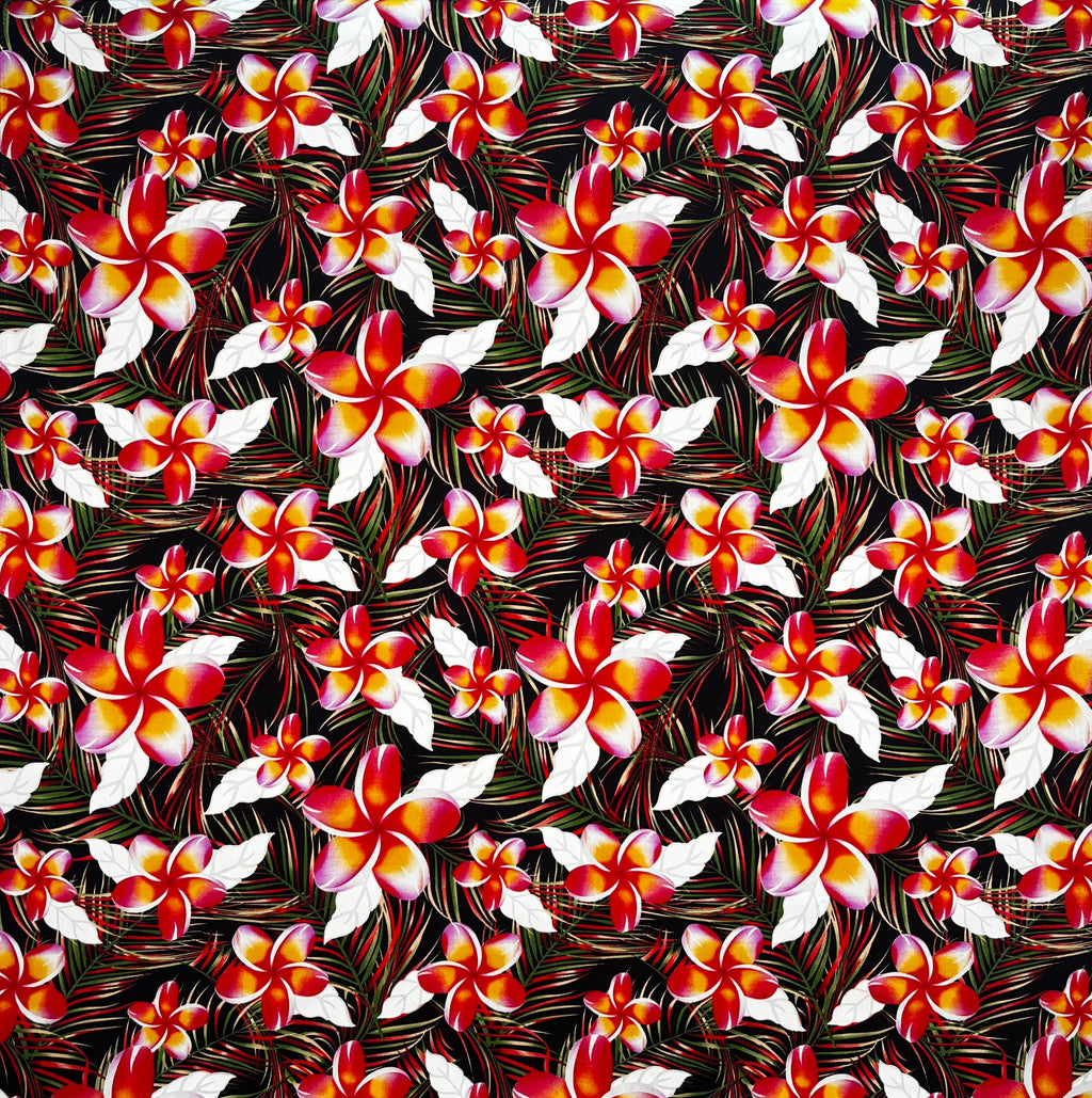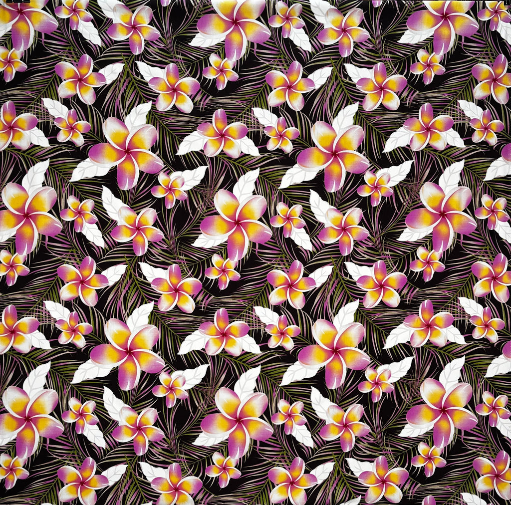Experience comfort and style with our Plumeria & Tropical Leaves Print | Rayon Poplin. Made from 100% Rayon Poplin, this fabric is soft, lightweight, and perfect for warm weather. Available in 5 vibrant colorways featuring beautiful plumerias, banana leaf, and palm leaf designs. Add a touch of the tropics to your wardrobe!