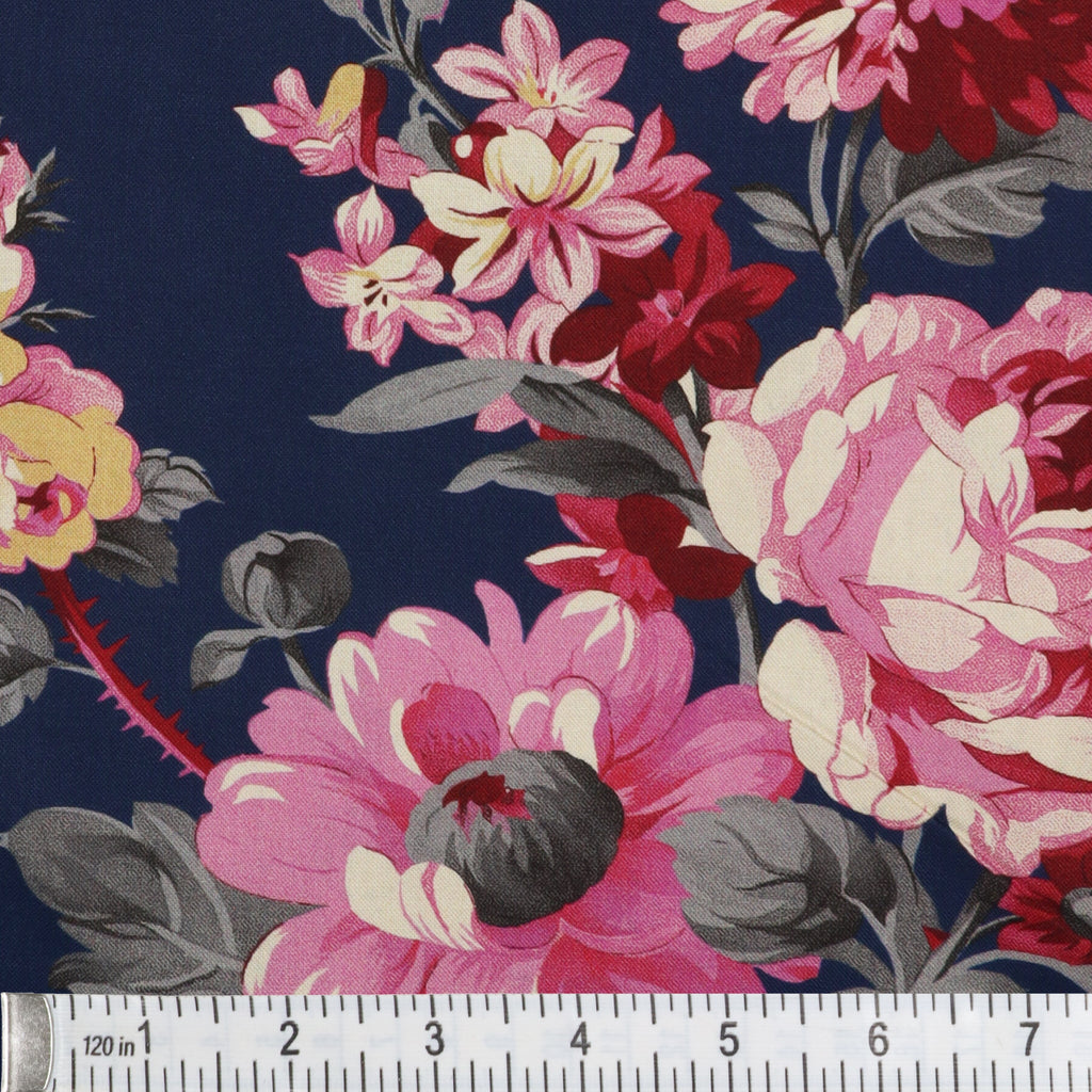 Let your projects bloom with rich color and timeless charm using the Rose Garden Sapphire fabric. Set against a deep, sophisticated sapphire blue background, this eye-catching print showcases abundant roses, dahlias, and blossoms in vibrant pinks, buttery yellows, and romantic reds. Soft gray leaves and subtle shadows add contrast and depth, creating a balanced composition that feels both classic and bold. Whether used for quilt backings, statement borders, or full fabric panels, this floral design invites you to capture the grace and strength of a flourishing garden in full bloom.