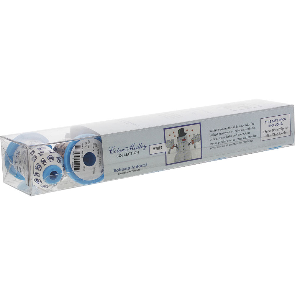 Combining the most popular color groups for embroidery enthusiasts, Robison-Anton Winter Colors Themed Embroidery Collection contains 8 Super Brite Polyester 1100 yard Spools: #5672 Dark Brown; #5524 Beige; #9163 Coal Hill; #5597 Snow White; #5853 Dark Army Green; #5824 PN Navy; #5575 Slate Blue; and #5552 Russet.