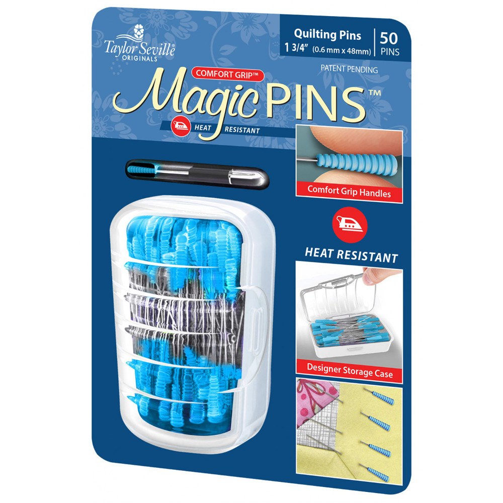 Magic Pins feature blue comfort grip heads that are resistant to heat. Use these 1-3/4-inch quilting pins in your projects and iron directly on them without damaging them. Available in a 50 with designer case.