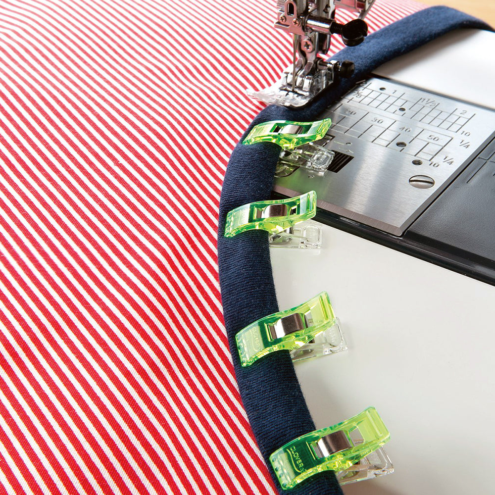 Clover's new wonder clips are a fun, new alternative to pins! These little fabric clips hold your fabric layers together while you sew, instead of using pins that are sharp and can pin your fingers. Since they hold a wider area, you can use them with thick layers or multiple layers. The clear, flat bottom, sits smoothly on a tabletop or sewing machine and has seam allowances for 1/4 inch and 1/2 inch.
