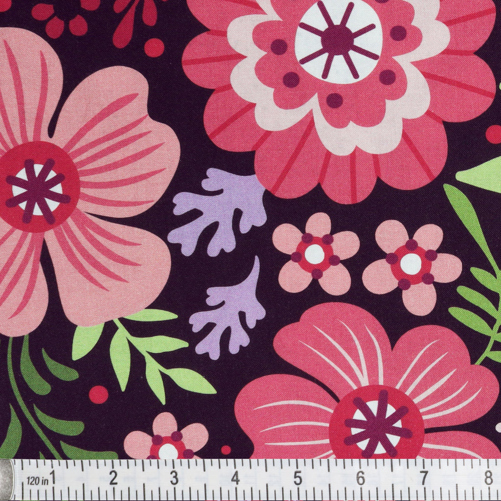 Turn up the romance with the Wallflowers fabric in Aubergine from the Secret Garden 108" Wide Quilt Backing collection. This rich purple backdrop provides a luxurious canvas for stylized floral motifs in shades of rose, lavender, crimson, and fresh leafy greens. The scattered red berries and petite blossoms add whimsy, while the deep base gives the print a dramatic, cozy feel. Perfect for backing heirloom quilts or sewing standout décor pieces, the wide format offers seamless coverage and ease. The Aubergine palette adds a sophisticated, moody twist to your floral-loving heart—just right for fall quilts or elegant feminine projects.