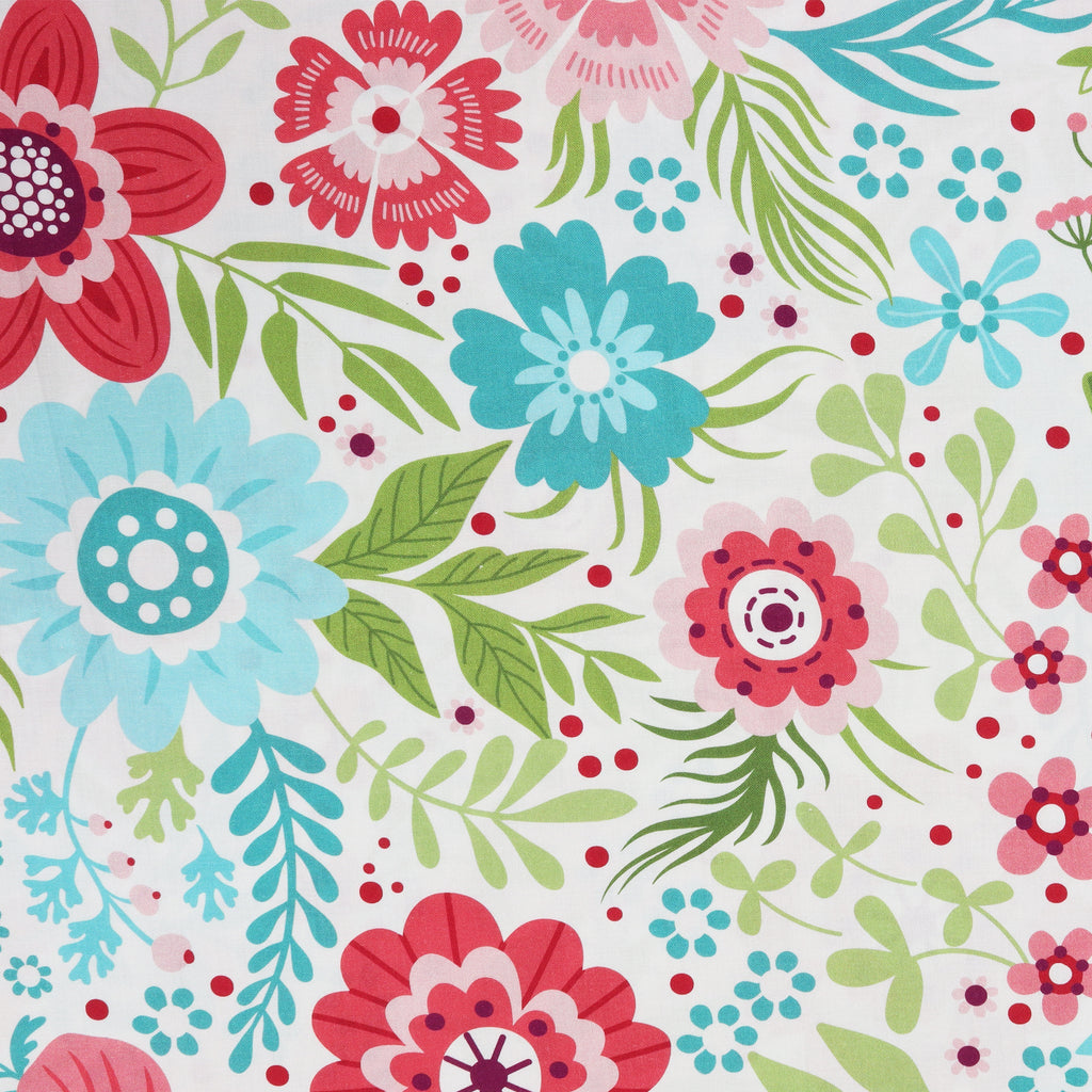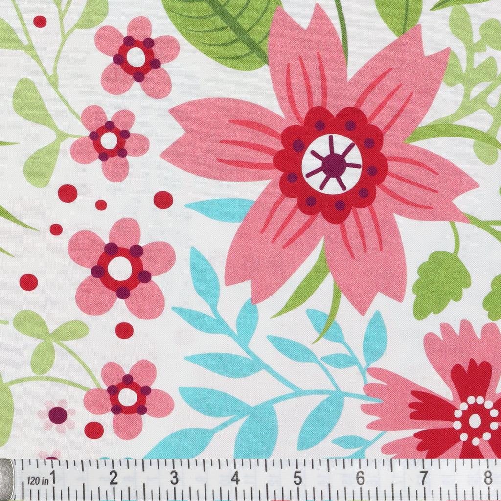 Infuse your quilt projects with cheerful charm using the Wallflowers fabric in Vanilla from the Secret Garden 108" Wide Quilt Backing collection. This design showcases oversized, whimsical blooms in bold berry-red, teals, and pinks dancing across a crisp white background. Delicate green foliage and scattered berry-red dots add lively texture, making this a perfect choice for light and airy quilt backs or statement home décor.