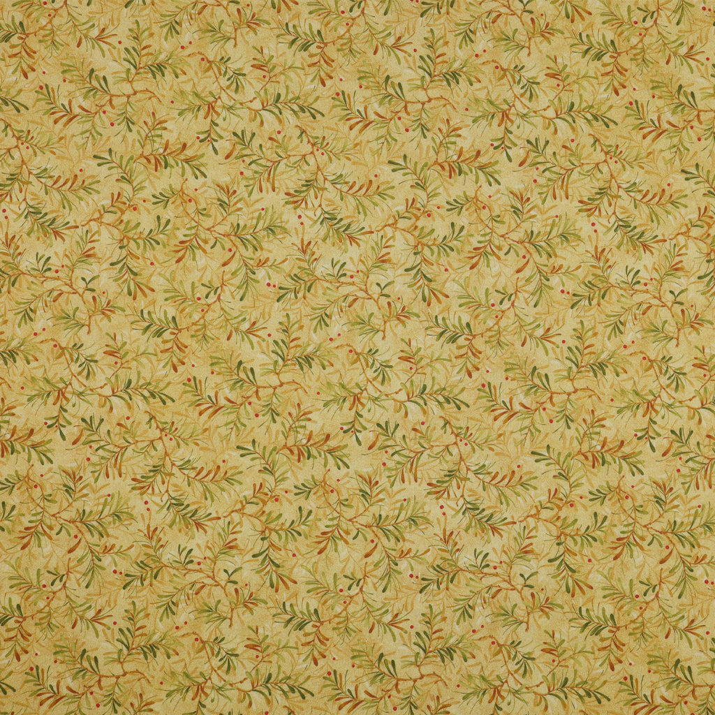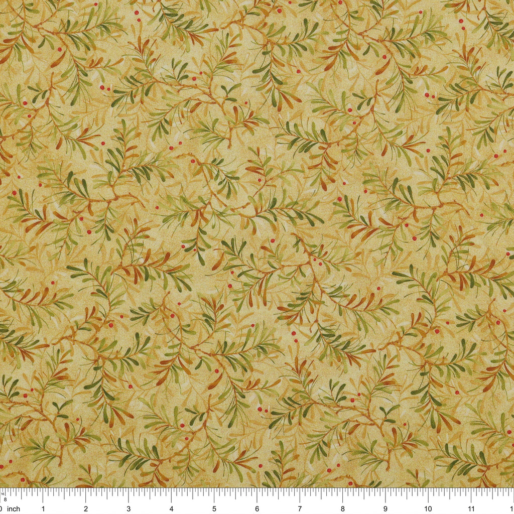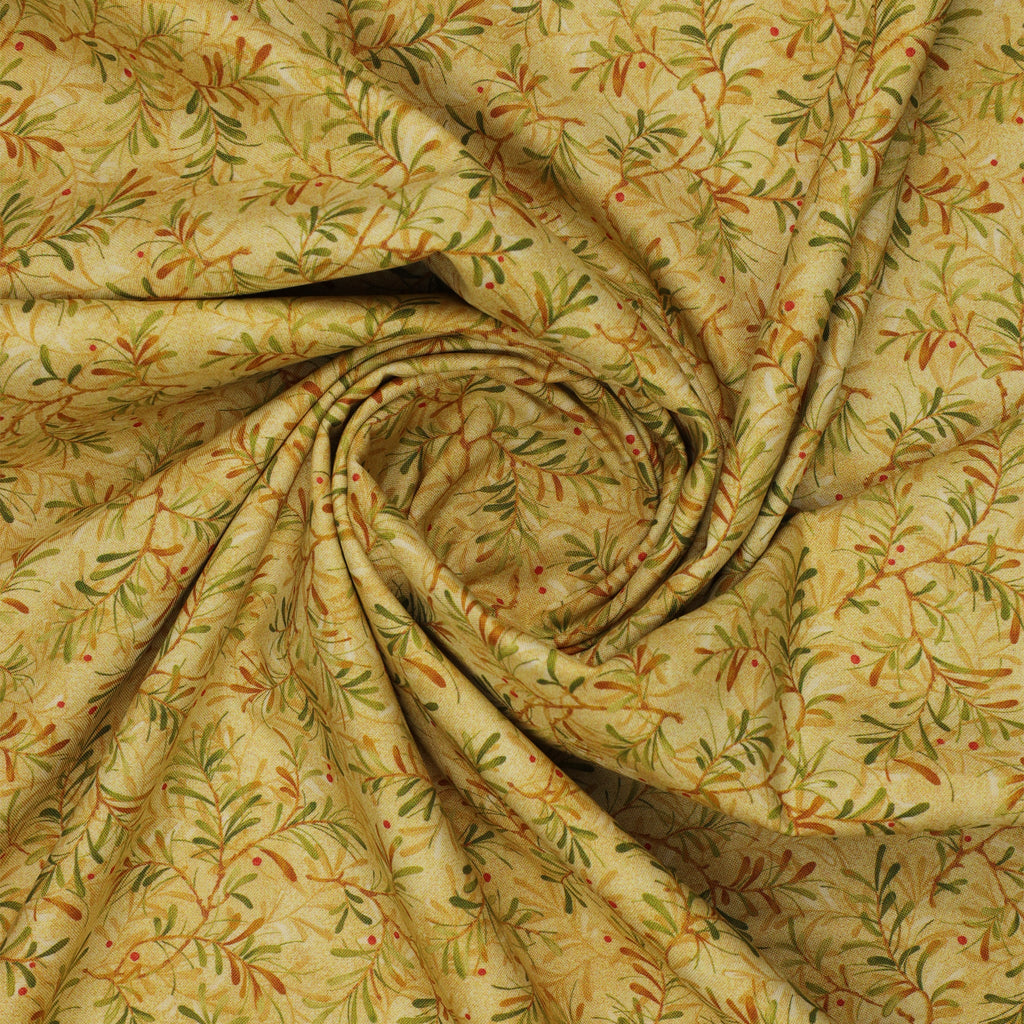Soft and radiant, Pine Boughs Ecru/Moss captures the glow of early morning light shining across a winter landscape. The warm ecru backdrop allows the pine boughs to gently unfurl in shades of moss and gold, creating a graceful, flowing rhythm throughout the print. Touches of red berries add a cheerful lift, giving the design a festive yet timeless feel. The subtle texturing in the background adds depth without overpowering, making it a beautiful companion for both traditional and modern quilts. With its wide 108" layout, this print delivers effortless elegance for any project meant to feel bright, warm, and thoughtfully finished.