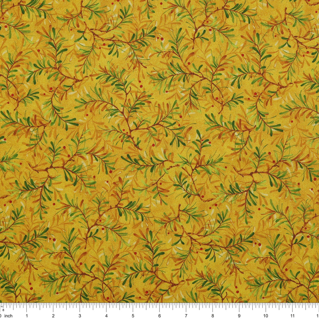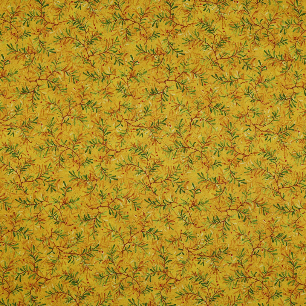 Radiating warmth like sunlight spilling across a holiday table, Pine Boughs Gold brings a joyful brightness to any quilt back. The golden tones shimmer around the flowing pine branches, creating a sense of movement reminiscent of branches swaying gently in a warm winter breeze. The scattered red berries add delicate pops of color, giving the design a playful yet refined finish. Thanks to its 108" width, it lies smoothly across large quilts, providing beauty without distraction. Use this print whenever you want your quilt to feel cheerful, inviting, and touched with a celebratory glow.