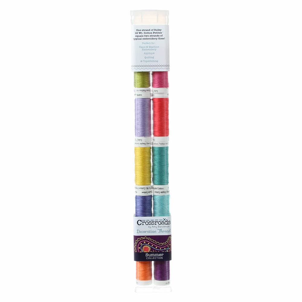 Get the most out of your thread by using Sulky's Petite Crossroads Denim 10 Spool Thread Kit. Each strand of this 12-weight thread equals two strands of typical embroidery floss; making them ideal for embroidery, applique, quilting, and topstitching. All of Sulky's cotton threads are made using high quality, long-staple, mercerized Egyptian cotton with a matte finish to create a soft, warm, natural look and feel that you will be hard-pressed to find with other brands. The Sulky Petites, Crossroads Denim Thread Kit contains 10 spools with 50-yards on each reel. Choose from eight color palettes: Broadway, Central, Fall, Grand, Spring, Summer, Westport, and Winter.