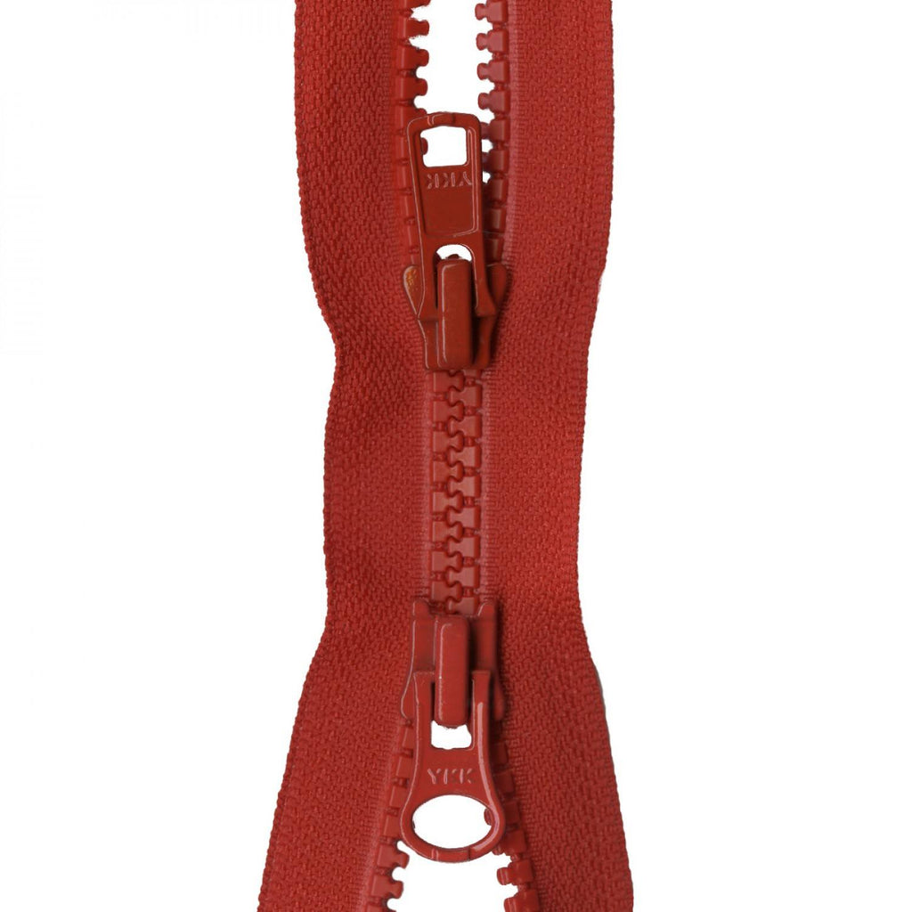 Lightweight, strong, and durable zipper is constructed of chunky Vislon resin-molded teeth that will not freeze or corrode. Great in outdoor wear and polar fleece! 100% Poly Tape. Plastic interlocking teeth (teeth size = 5mm). Separating. Two Slides.